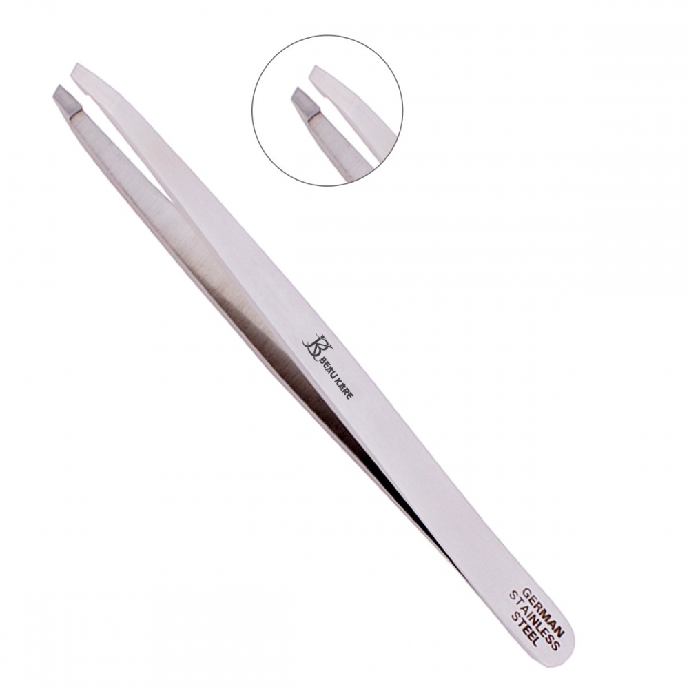 “Slim Body Tweezer” hand-filed German Stainless Steel slim body slant tip tweezer 3.5”. A delicate shaped narrow tip tweezer precisely removes hair without breakage